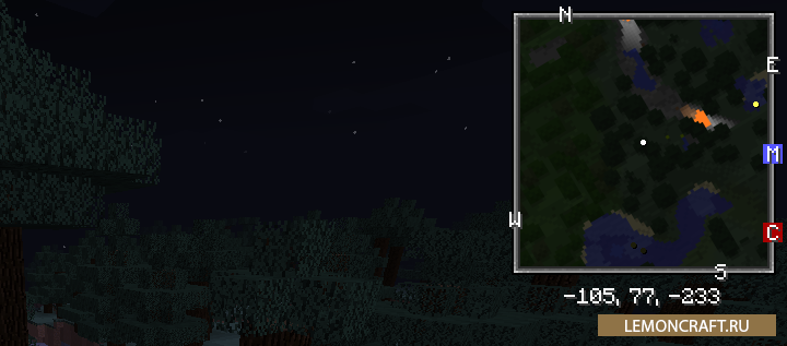 Мод Xaero's Minimap добавляет в игру приятную мини-карту. Это одна из самых лучших мини-карт, которые можно увидеть в игре майнкрафт. Автор мода постарался добавить все нужные элементы. На мини-карте будут отображаться мобы, игроки, пещеры, биом в котором вы находитесь. Каждый элемент имеет свой цвет, что позволяет быстро соориентироваться, где что находится.